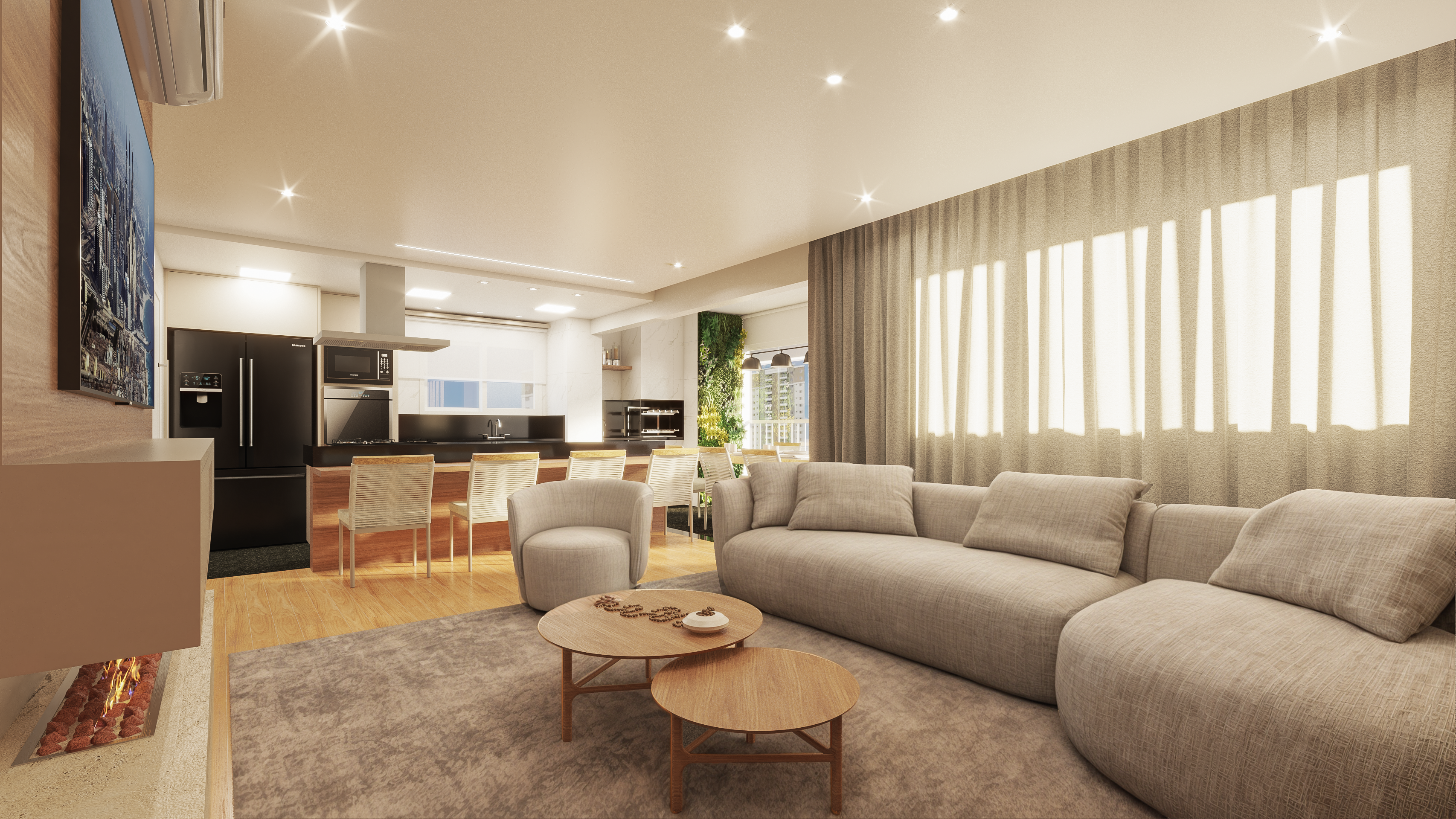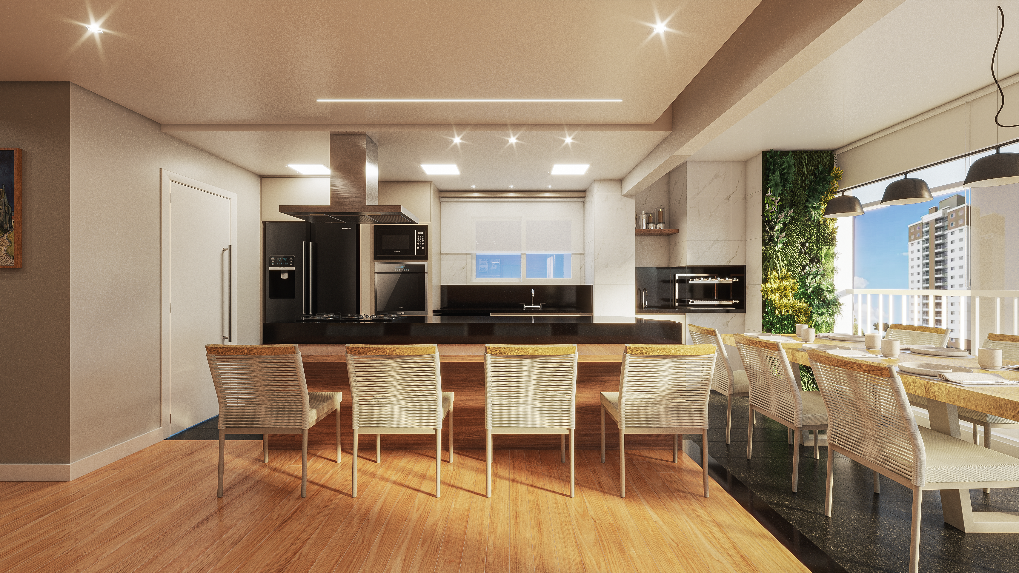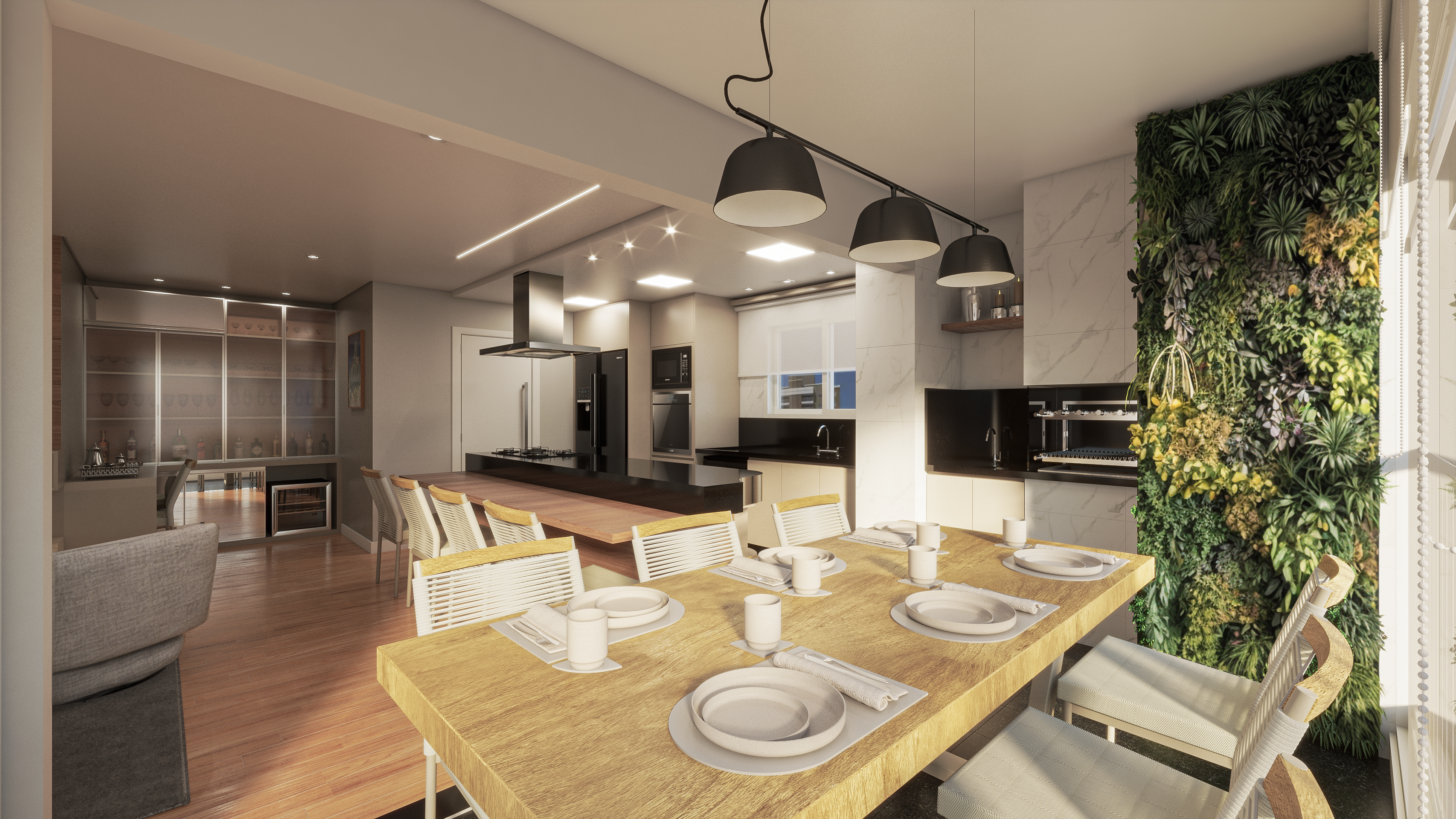 A ideia principal dos clientes era criar um ambiente mais amplo e acolhedor para receber visitas. Para alcançar esse objetivo, decidimos transferir a sala de jantar para a varanda, integrando os espaços e criando um fluxo harmonioso entre a cozinha, sala e varanda. Principais Intervenções: Transferência da Sala de Jantar: A varanda foi transformada em um aconchegante espaço de jantar, proporcionando uma experiência de refeição mais próxima da natureza. Integração dos Espaços: Removemos barreiras físicas para criar um ambiente aberto e arejado, permitindo uma fácil circulação entre a cozinha, sala e varanda. Bancada de Refeições Rápidas: Uma bancada moderna foi incorporada à ilha da cozinha, oferecendo um espaço prático para refeições rápidas e aumentando a funcionalidade da cozinha. Painel de Privacidade: Um painel estratégico foi posicionado na entrada para garantir maior privacidade para os quartos, criando um ambiente mais íntimo e reservado. Resultados: Com essa transformação, o espaço se tornou mais acolhedor, amplo e funcional. A transferência da sala de jantar para a varanda permitiu uma melhor aproveitamento do espaço, enquanto a integração dos ambientes criou um fluxo harmonioso e moderno. A bancada de refeições rápidas na ilha da cozinha adicionou praticidade, e o painel de privacidade na entrada garantiu a intimidade desejada para os quartos.